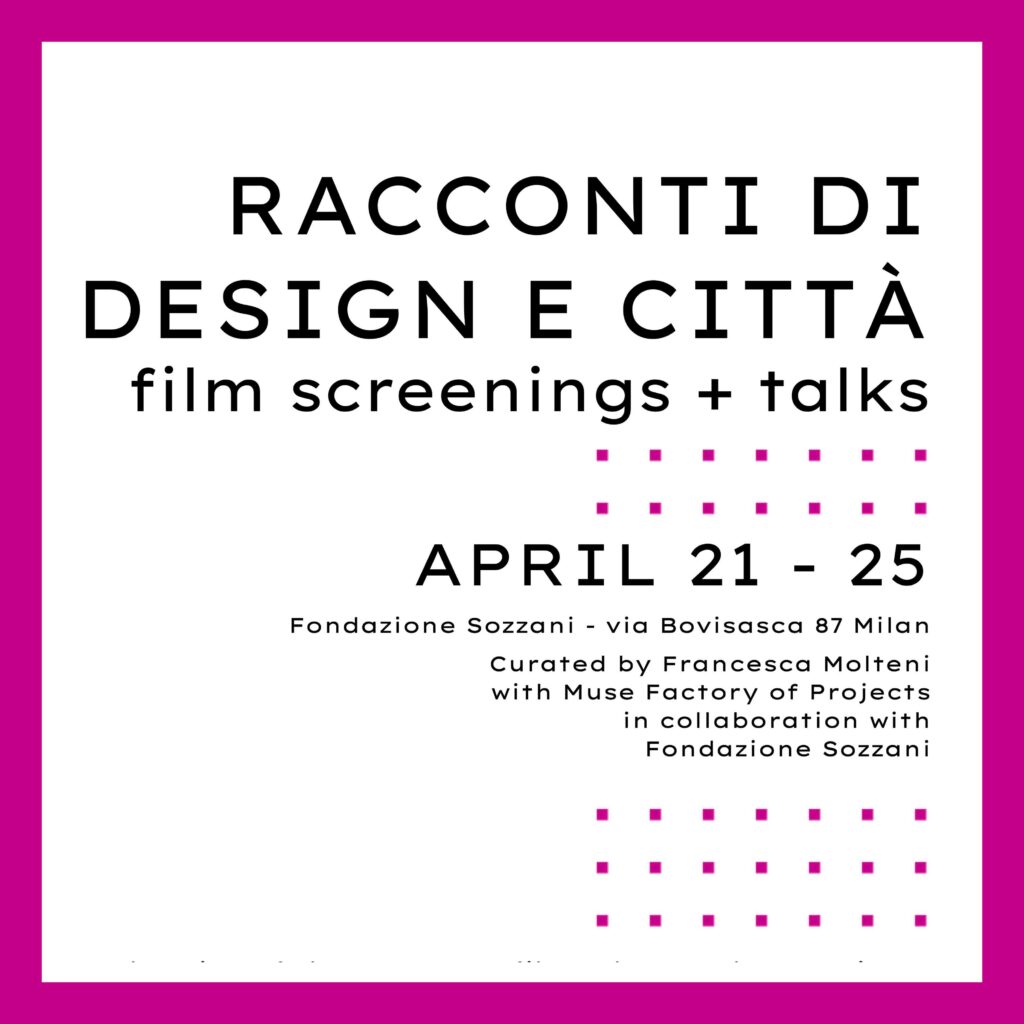 RACCONTI DI DESIGN E CITTÀFILM SCREENING + TALKSACTIVITIESENCOUNTERS AND PRESENTATIONSMILAN BOVISAFROM TUESDAY APRIL 21STTO SATURDAY APRIL 25TH