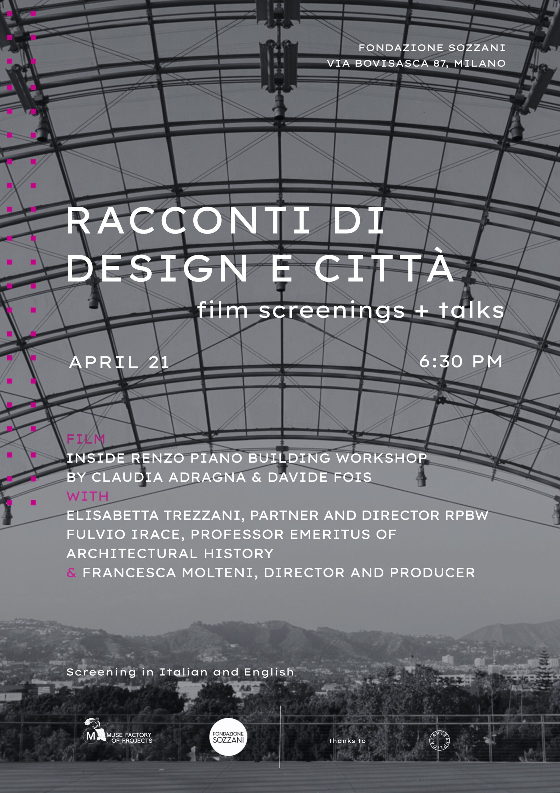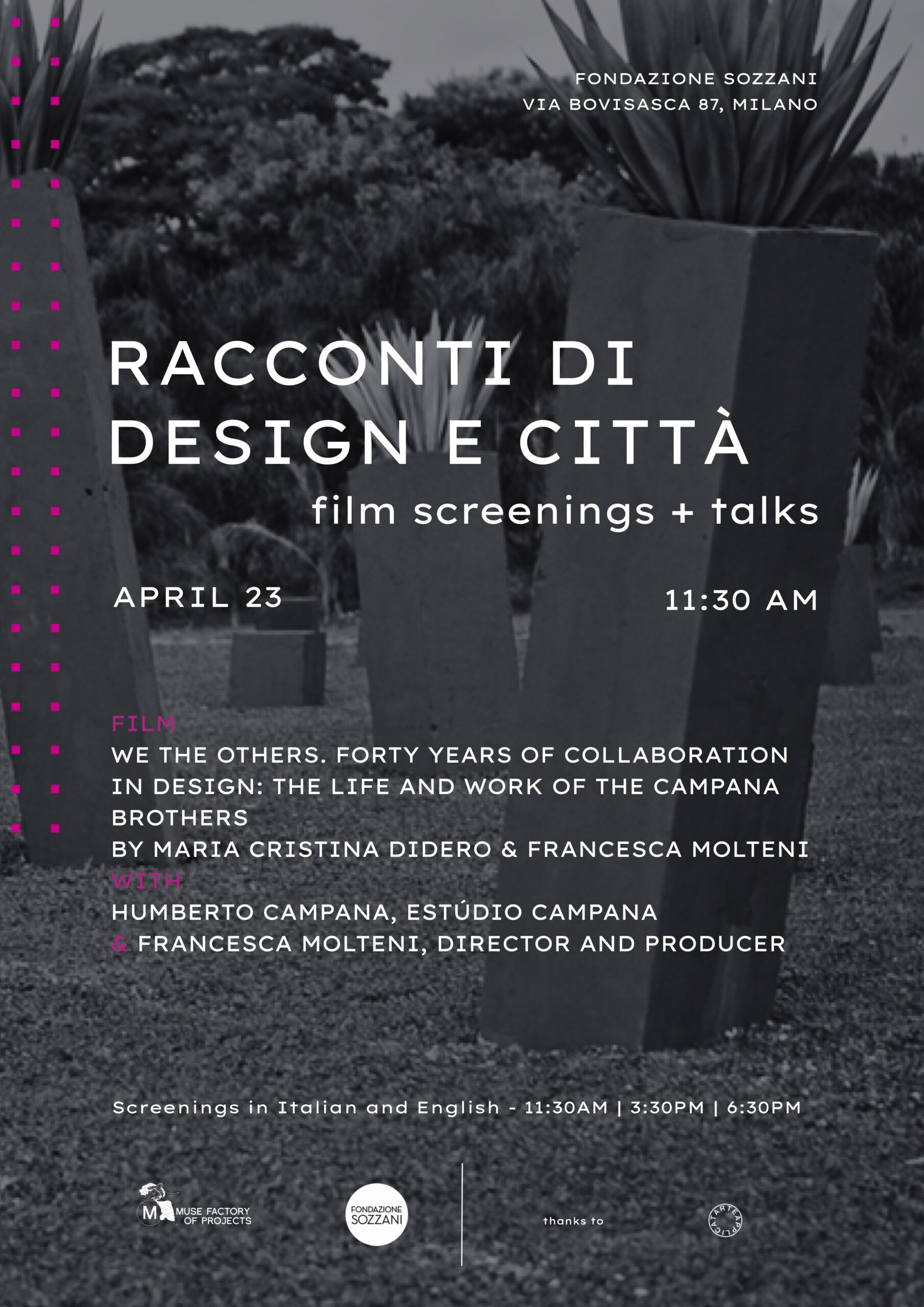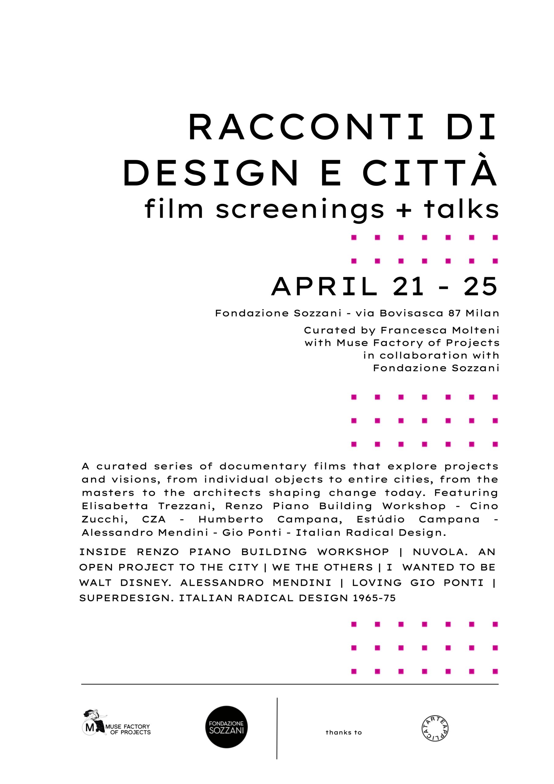On the occasion of Milan Design Week, Francesca Molteni with Muse Factory of Projects in collaboration with Fondazione Sozzani, presents RACCONTI DI DESIGN E CITTÀ. Film screenings + talks — a program of documentary films and talks exploring contemporary projects and visions. These include portraits of designers and architects, masters of Italian design, radical movements, design methodologies, and stories of new neighborhoods and cities in transformation.